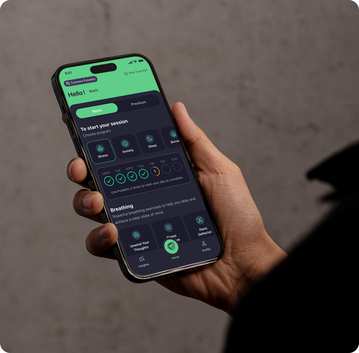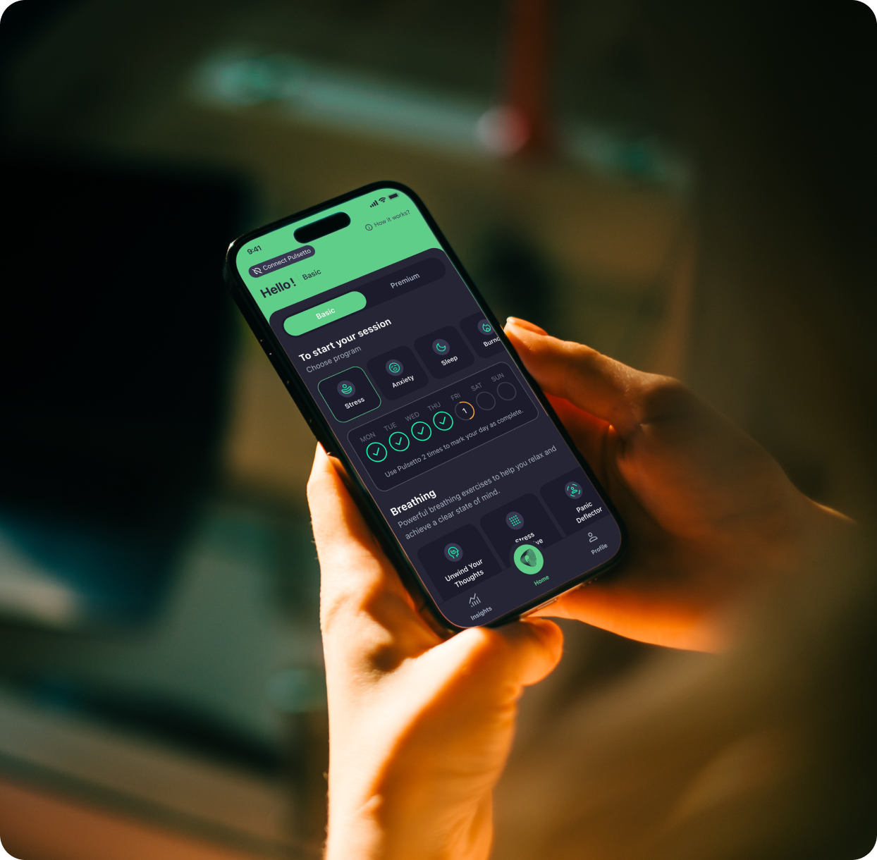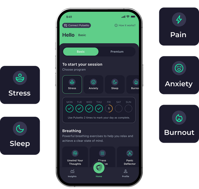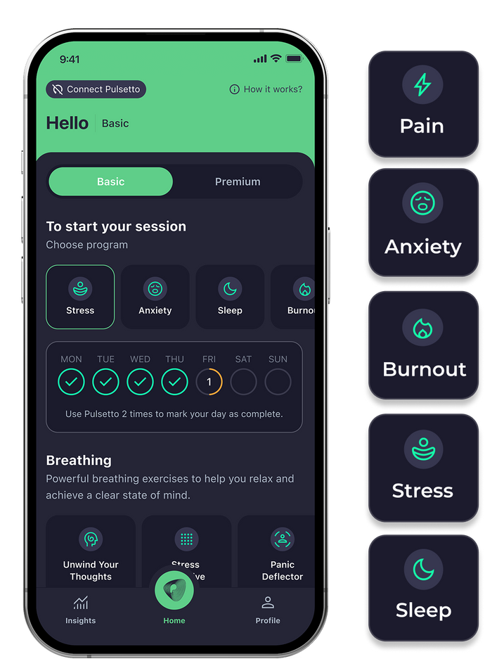 We're constantly working on improving the Pulsetto app. New features are added regularly and many more are planned to be developed in the near future. Currently, premium users get access to unique Pulsetto meditations library, breathing exercises, affirmations, CNS tap test, advanced insights, extra stimulations, and more.