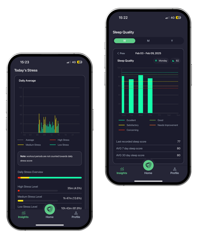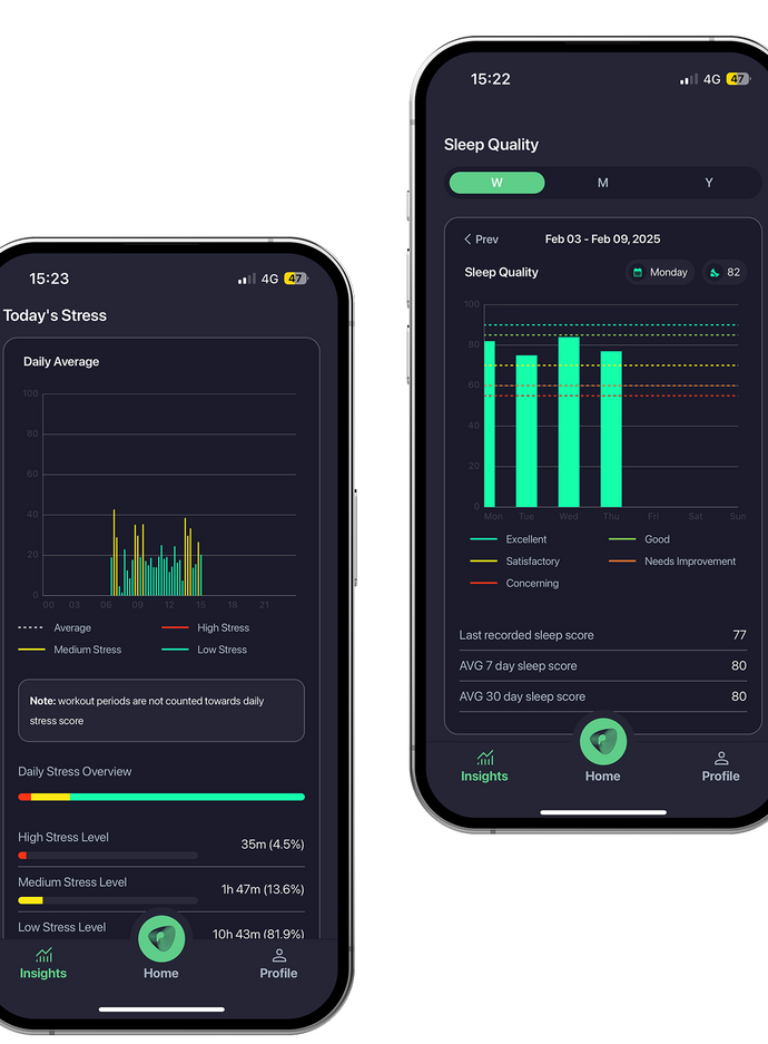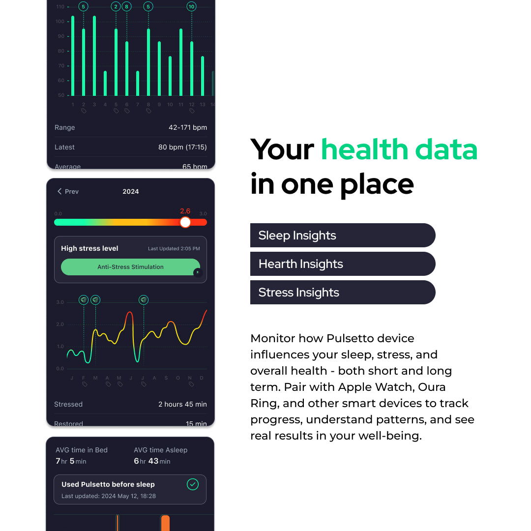 Pulsetto app users may look into their Pulsetto device use analytics and health log trends. Additionally, Premium may users may connect their smart health trackers and see their Sleep, Stress, Heart insights and trends.